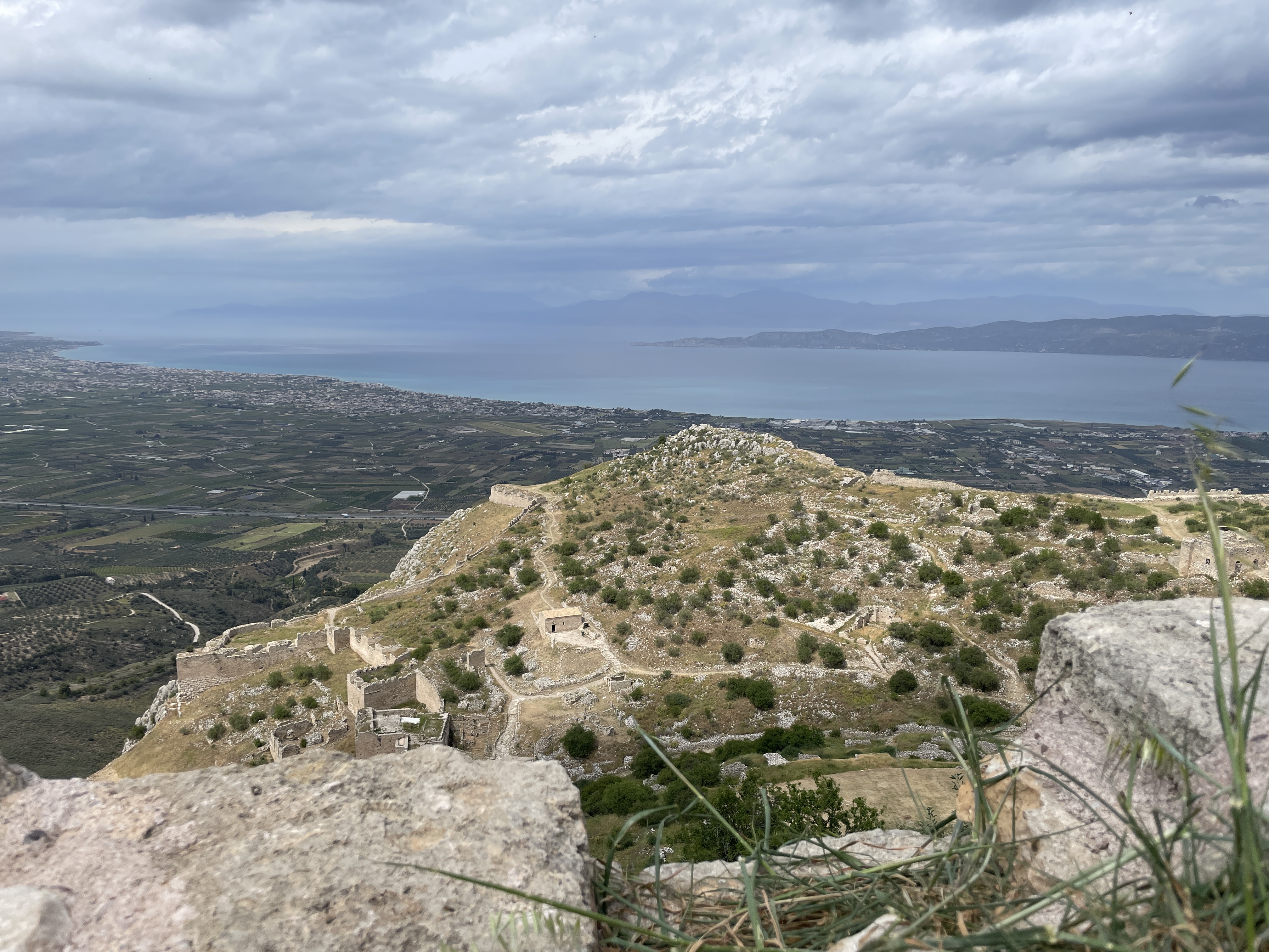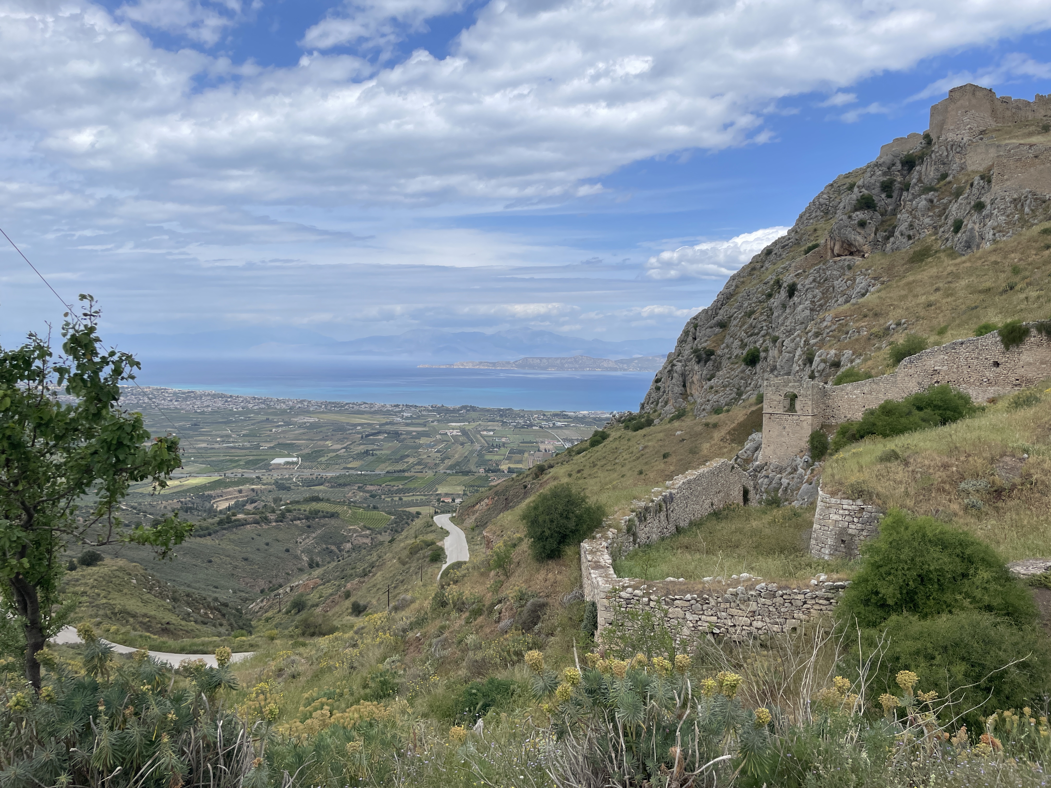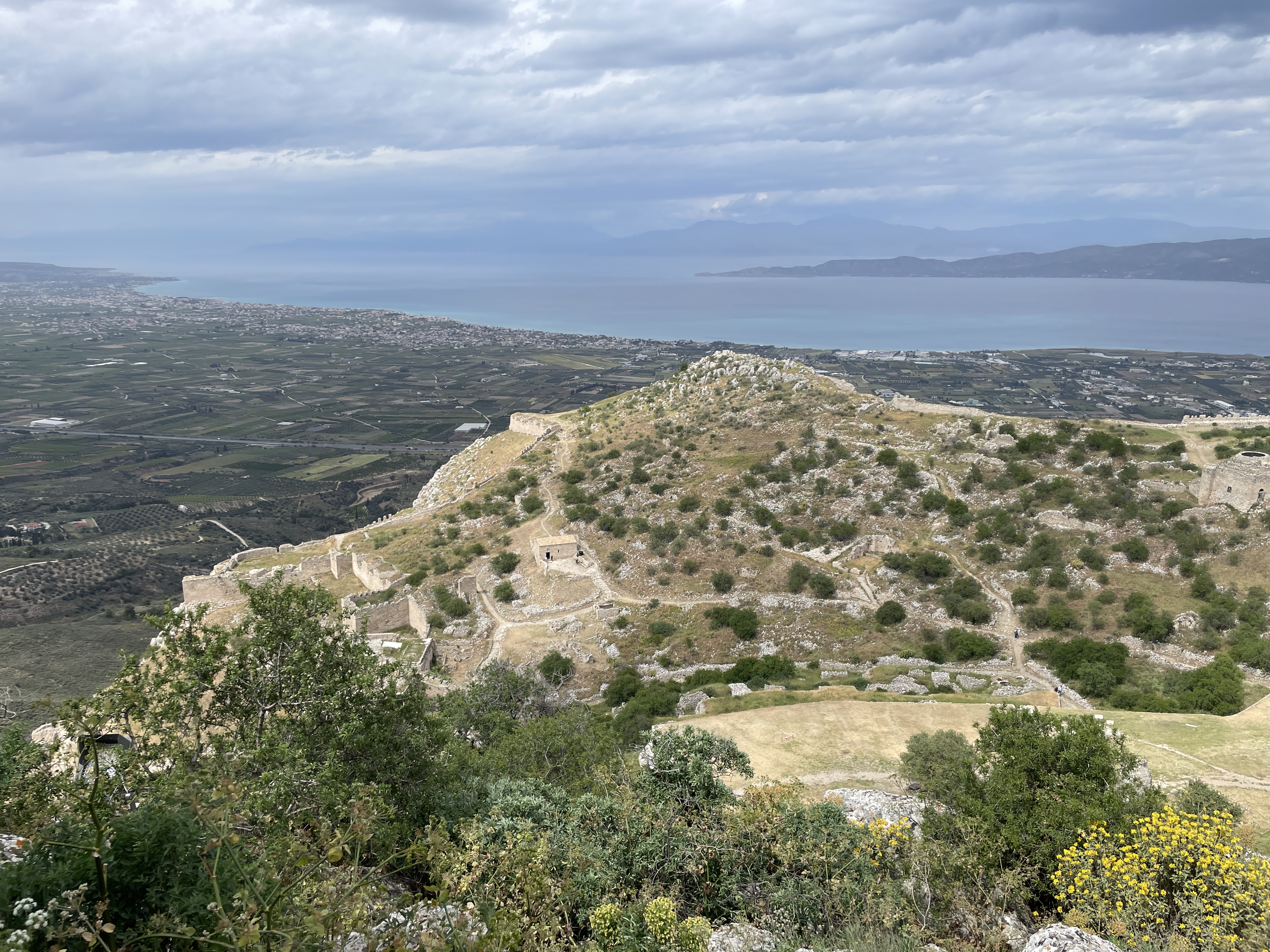 Seated about the ruins of ancient Corinth, on top of a 575 meter monolithic rock, the Acrocorinth was continuously occupied from the archaic period until the early 19th century. Its fortress, one of the most impressive ones in Greece, is built on foundations dating from the Hellenistic period (3rd century BC). It was continuously occupied until the early 19th century. At the highest summit was the Temple of Aphrodite.