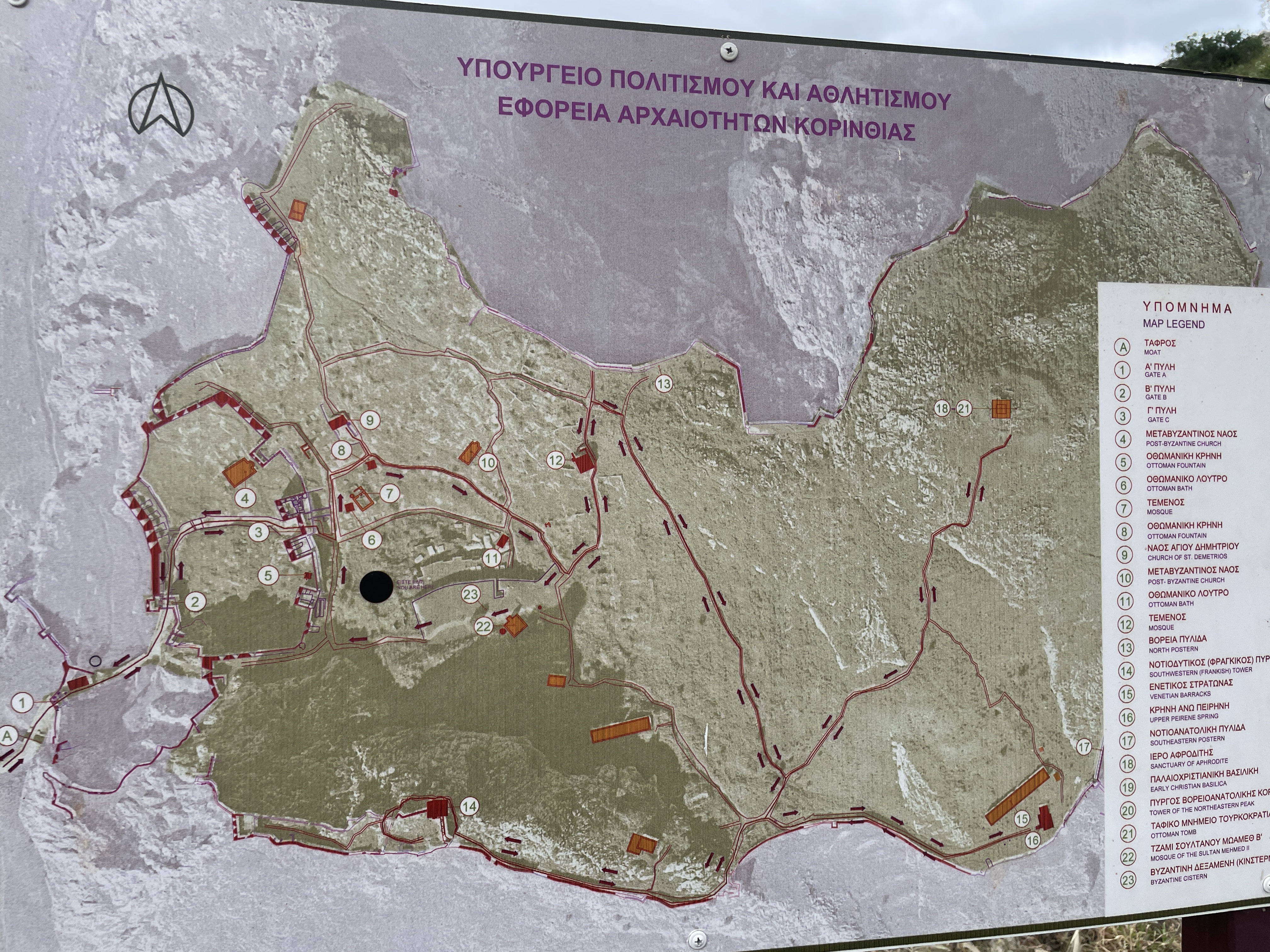 Within the third enclosure wall on the Acrocorinth are to be found monuments of all periods: at the highest point, the sanctuary of Aphrodite with an early Christian basilica on its ruins, the fountain of Ano Peirene, Byzantine cisterns, the Frankish tower, a Venetian church, mosques, Turkish houses and fountains.
